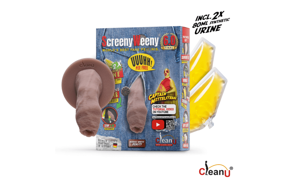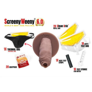 Each ScreenyWeeny is delivered with 2x 80 ml synthetic urine, an empty bag for practice, a thermo bag for keeping the urine warm, one pack of HeatPaxx and a refill syringe.